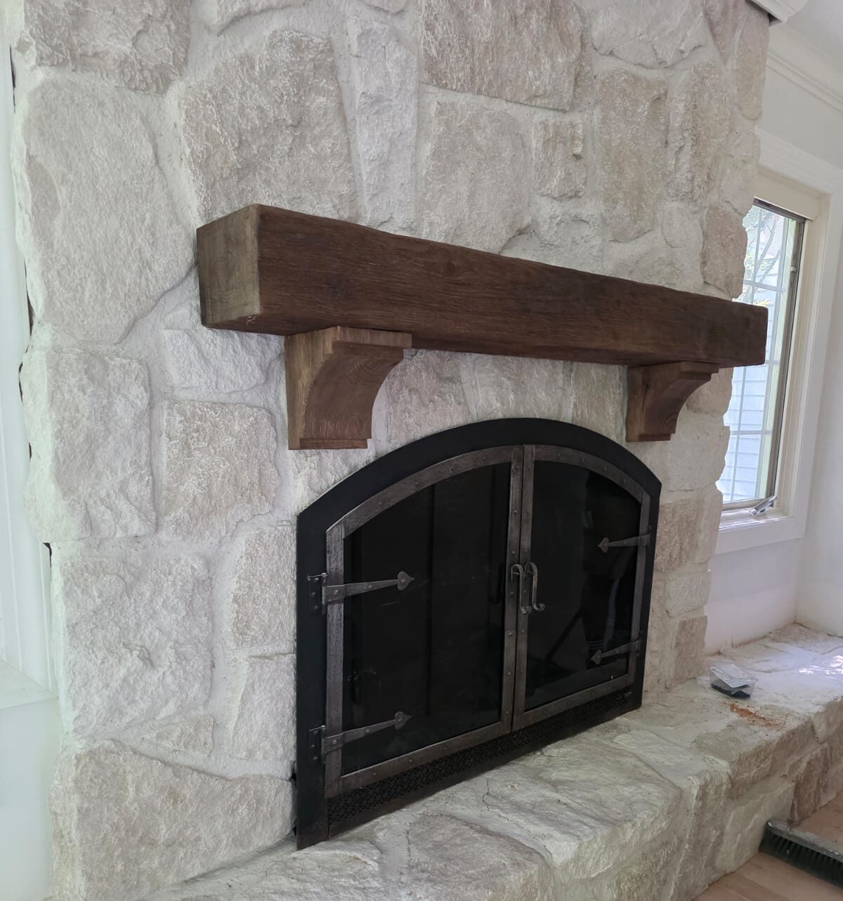 We produce high-quality reclaimed, and new wood fireplace mantel surrounds in various unique styles in NJ. Reclaimed, hand-hewn, rough-sawn, rustic texture, and wire brushed to look old.